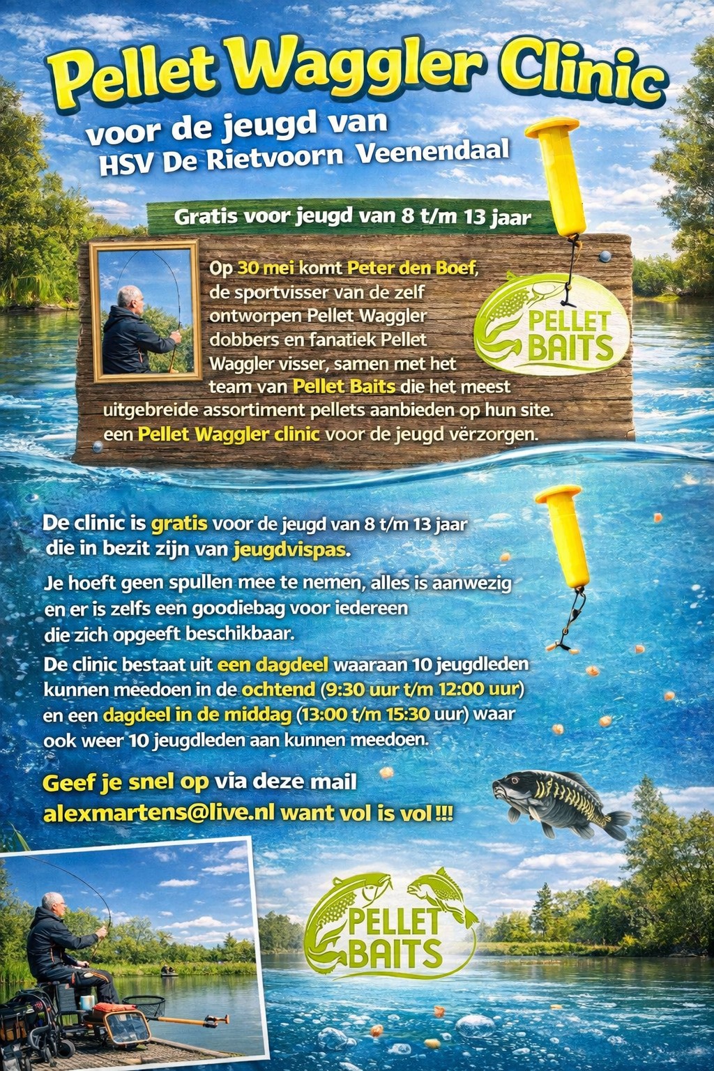 Geef je snel op voor de clinic om te leren vissen met de Pellet Waggler en leer alle fijne kneepjes van niemand minder dan Peter den Boef. Deze zeer bekende sportvisser heeft zelf veel soorten van de Pellet Waggler dobber ontworpen.